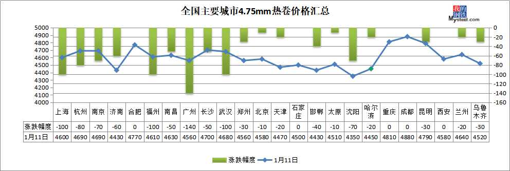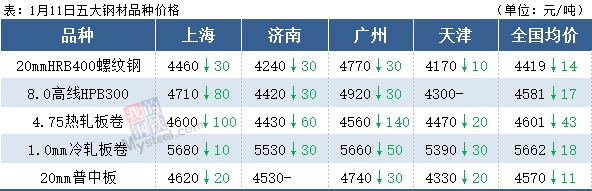 建筑鋼材:1月11日,全國25個主要城市20mm三級螺紋鋼均價4419元/噸,較上個交易日下跌14元/噸。具體來看,期螺震蕩走低,上午國內建筑鋼材價格穩中有松。午后隨著期貨繼續下挫,市場心態低迷,全天成交表現較差。目前來看,臨近春節假期,多數商家主動冬儲意愿不強,市場交投氛圍或逐步減弱,庫存持續累積。因此預計明日國內建筑鋼材價格或繼續偏弱震蕩。