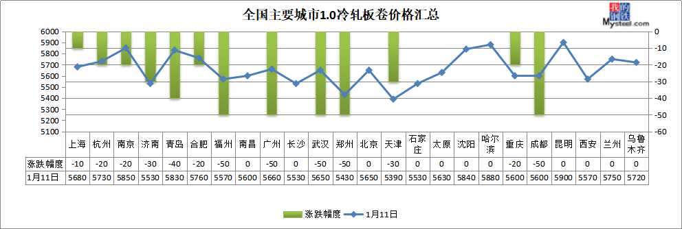 冷軋板卷:1月11日,全國24個主要城市1.0mm冷卷均價5662元/噸,較上個交易日下跌18元/噸。今日黑色系期貨震蕩走弱,現貨市場整體表現疲軟,現貨熱軋跌勢明顯,受此影響,冷軋價格大部分區域小幅回落。據市場反饋,近期整體成交偏弱,到貨有所增加,庫存開始小幅累庫,商戶多以出貨為主,多清庫過節。下游行業多按需采購,采購積極性一般。預計明日全國冷軋多持續小幅下調為主。