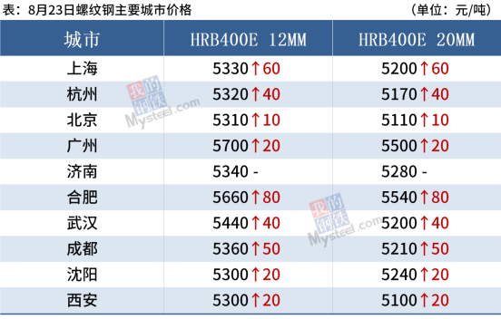 建筑鋼材:8月23日,全國31個主要城市20mm三級抗震螺紋鋼均價5273元/噸,較上個交易日上漲28元/噸。具體來看,早盤期螺高位震蕩,上午國內多數主要市場建筑鋼材價格延續周末漲勢,個別城市漲幅較大。從成交方面來看,受期螺高位回落,現貨市場多持漲后價格,交投氛圍表現一般,全天成交好于上一交易日。目前來看,受雙焦市場領漲,帶動成材推漲,但由于當前現貨仍然處于供需雙弱局面,后期仍然需要關注供應端政策的擾動,預計24日國內建筑鋼材市場價格延續偏強震蕩為主。