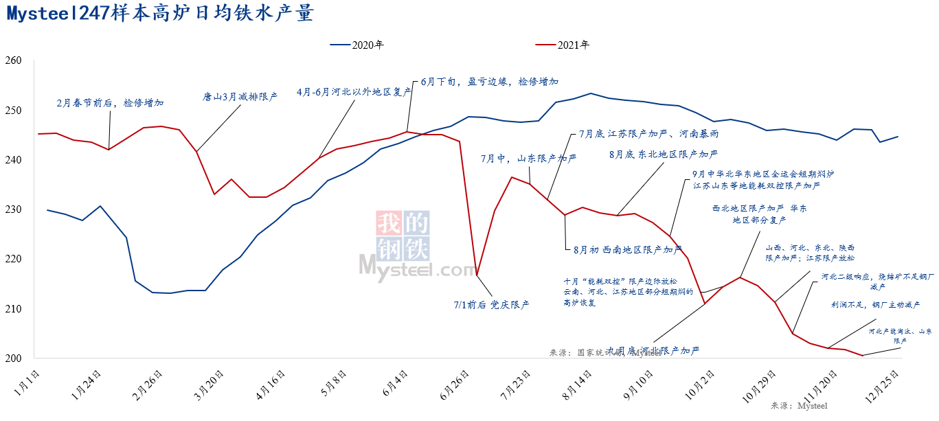 2021年3月,市場傳言“唐山地區(qū)鋼鐵產(chǎn)能減少30%”,但其他地區(qū)并未減產(chǎn),所以全國鋼鐵產(chǎn)量很快恢復(fù)至正常水平。2021年6月,市場又傳言“上半年既往不咎,下半年鋼鐵產(chǎn)量”平產(chǎn)。特別是7月1日之后,鋼鐵產(chǎn)量急速下滑。限產(chǎn)已經(jīng)成為被市場接受的事實,但限產(chǎn)計劃到底如何仍然不明。直至9/10月“能耗雙控”政策被嚴(yán)格執(zhí)行后,市場逐步明確和接受“2021全年鋼鐵產(chǎn)量同比去年減3000萬噸左右”的事實。