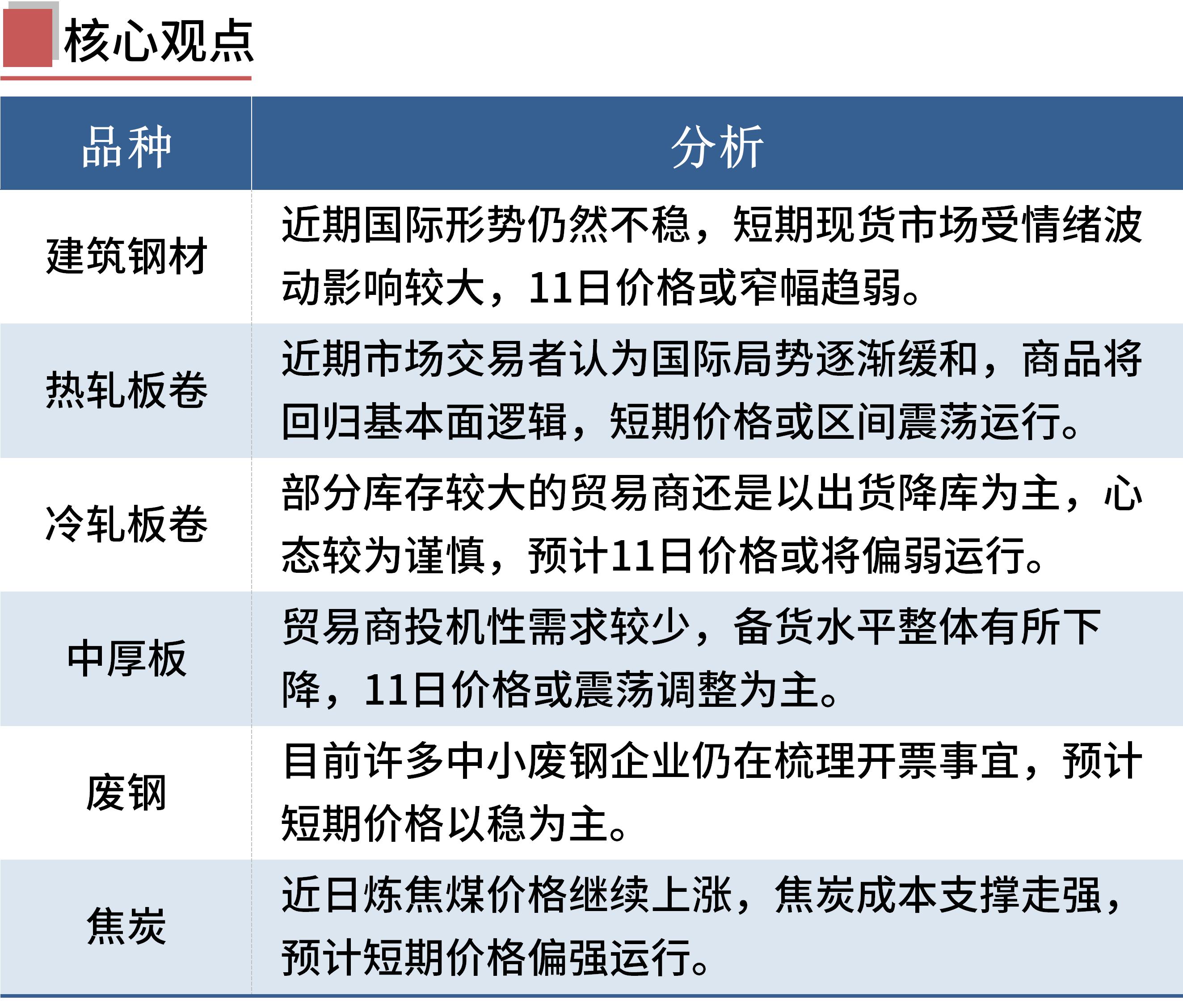 建筑鋼材:3月10日,全國31個主要城市20mm三級抗震螺紋鋼均價4961元/噸,較上個交易日下跌34元/噸。本周供給繼續小增,庫存迎來拐點,且降幅尚可。綜合來看,目前供給仍然處于回升階段,但整體增量有限;需求方面,隨著天氣逐漸好轉,需求有所回升。考慮到近期國際形勢仍然不穩,短期現貨市場受情緒波動影響較大。因此預計11日國內建筑鋼材價格將繼續窄幅趨弱為主。
