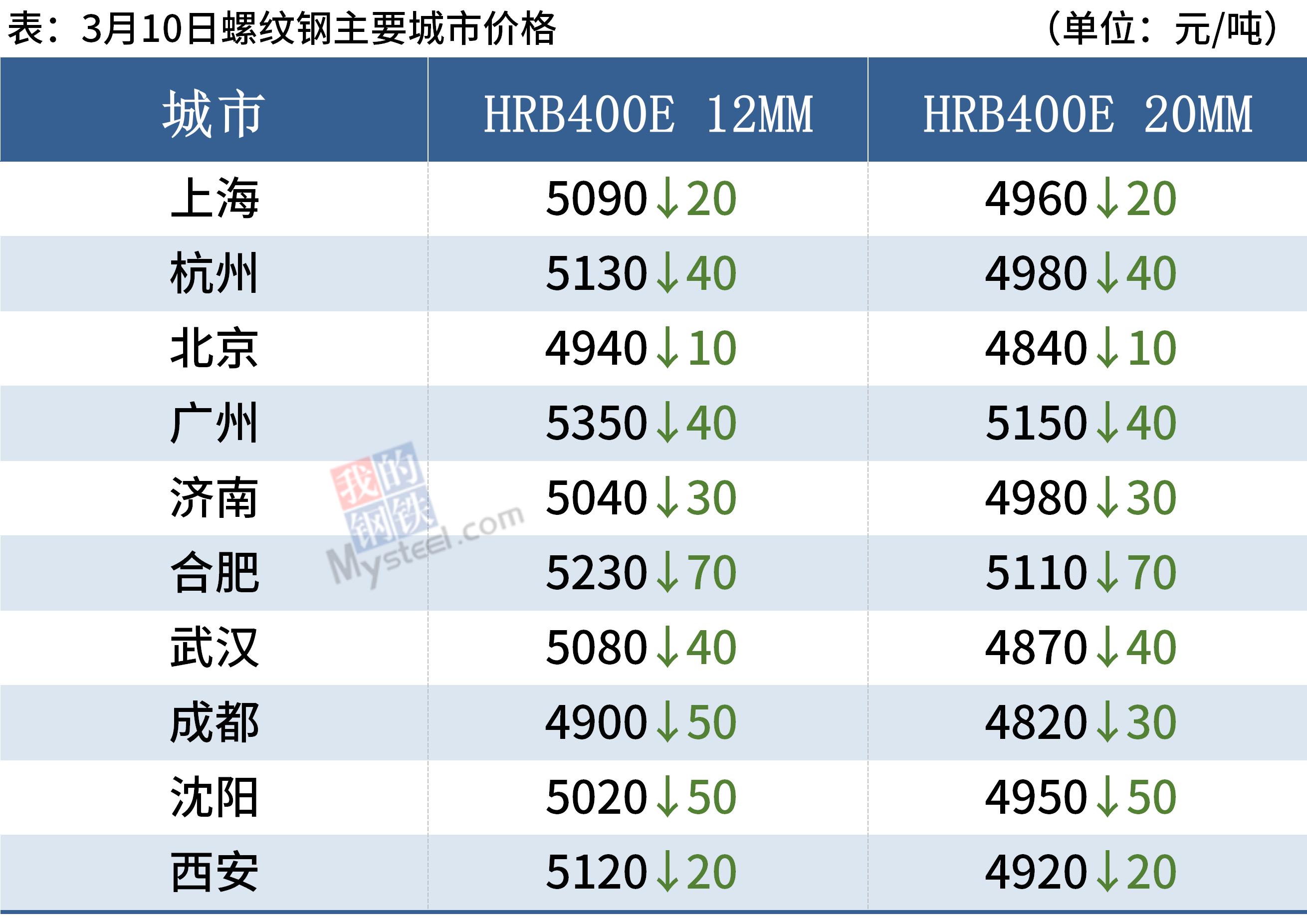 3月10日,國內鋼材市場普遍下跌,唐山普方坯出廠價下跌40報4720元/噸。9日國際原油、有色金屬價格大幅下跌,導致10日早盤國內黑色商品期貨市場大幅低開,午后跌勢收窄,低位成交較好。