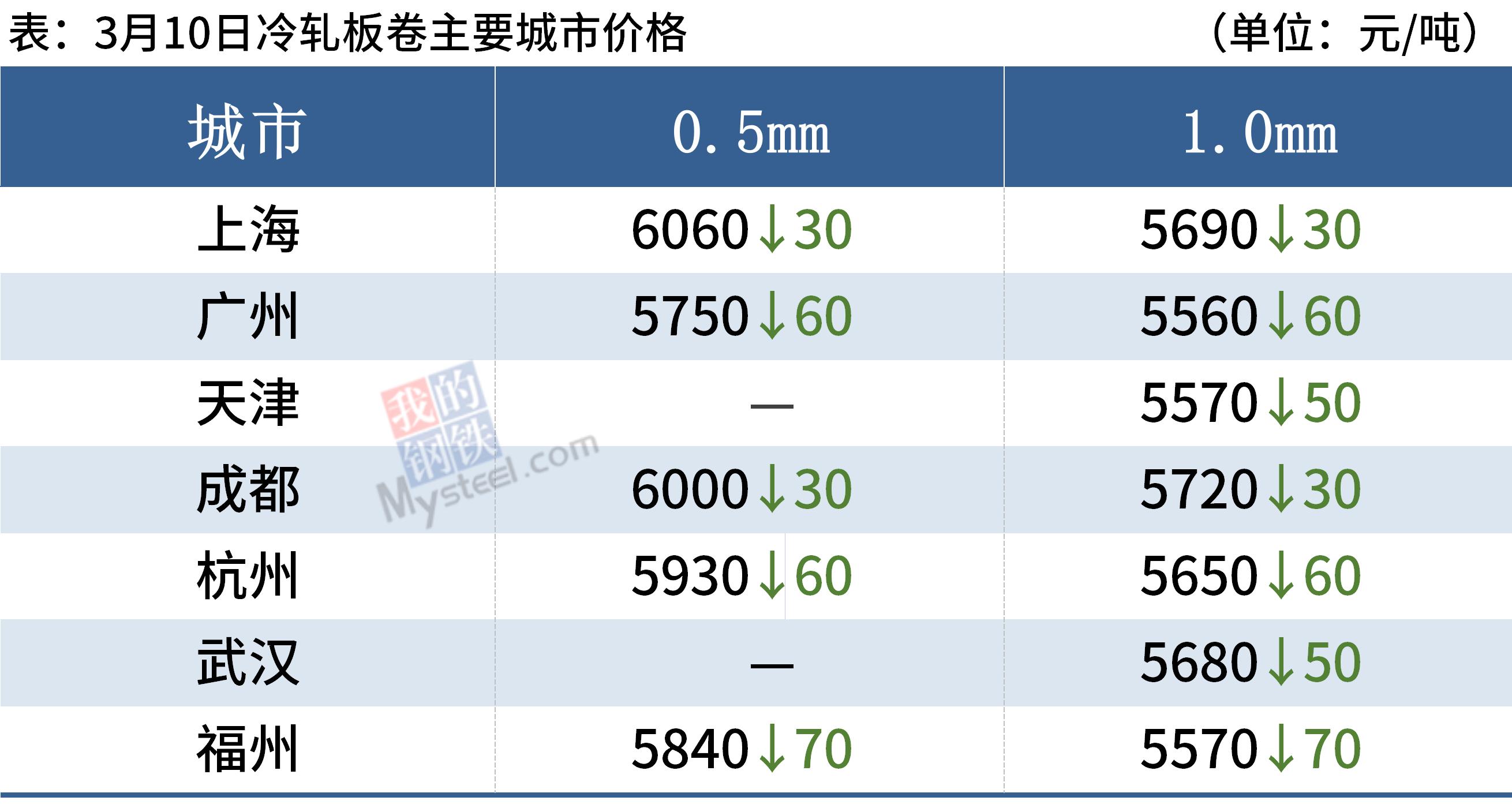 冷軋板卷:3月10日,全國24個主要城市1.0mm冷卷均價5677元/噸,較上個交易日下跌31元/噸。隨著期貨盤面連續下跌,價格也隨之下調,市場交投氛圍明顯冷清,今日整體成交一般。心態方面,部分庫存較大的貿易商還是以出貨降庫為主,心態較為謹慎。庫存方面,據Mysteel不完全統計,現冷軋鋼廠庫存34.57萬噸,周環比減少2.23萬噸,社會庫存143.40萬噸,周環比增加0.97萬噸,周消費量80.22萬噸,環比減少2.64萬噸。綜合來看,故預計11日國內冷軋板卷價格或將偏弱運行。
