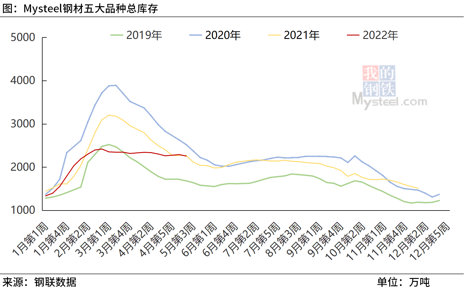 徐向春:庫存是反映鋼材供需關系的同步指標,二季度歷來是庫存快速去化的階段,但是今年一反常態。鋼材五大品種庫存總庫存3月3日見到2417.92萬噸的高點,5月12日為2254.74萬噸,10周的時間庫存僅降163.18萬噸,降幅為6.75%,而往年同期庫存降幅達30-35%,去化緩慢的主要原因仍是疫情導致的需求停滯。