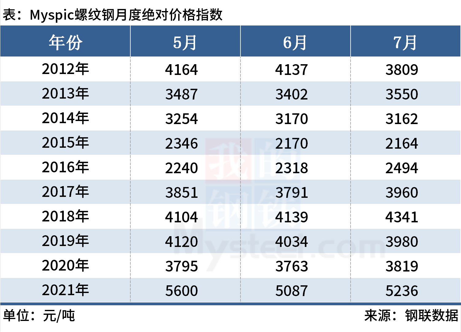 從最近十年的市場表現來看,Myspic螺紋鋼月度絕對價格指數在六月份價格3次上漲,7次下跌;七月份7次上漲,3次下跌。三季度的價格表現,往往具有“淡季不淡”的戲劇性效果。尤其對今年而言,疫情得到控制后,鋼材需求會有一個集中釋放,這將更為“淡季不淡”增添的一抹亮麗色彩。
