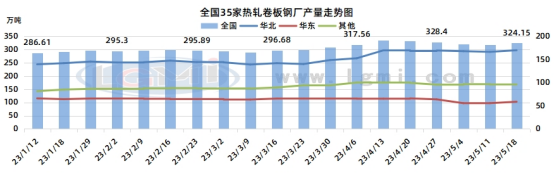 熱卷市場供強需弱的矛盾暫時難有解決,基本面偏弱的局面加劇市場業(yè)者的觀望情緒,貿易商傾向于降庫出貨為主,但下游以及終端對于后市信心不足入市采購謹慎,市場成交仍面臨一定阻力。蘭格鋼鐵網監(jiān)測的全國熱卷鋼廠主要指標顯示,5月19日鋼廠熱卷產量結束兩周下跌走勢迎來增加行情。追蹤國內35家熱卷企業(yè)熱卷總產量約324.15萬噸,較5月12日增加6.4萬噸。主要受前期減產以及檢修軋線恢復正常開工等影響。據了解,目前鋼廠熱卷利潤空間仍在成本線以下或處于盈虧平衡狀態(tài),部分鋼企利潤空間有所修復,也在一定程度上限制熱卷產量增加有限。另外,下周一條熱卷軋線存在檢修計劃,也將帶動熱卷產量存在下行表現。