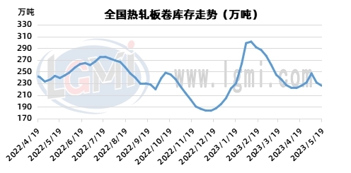 另外,熱卷庫存方面,鋼廠、大代理繼續(xù)降庫降風險為主。截止到5月19日鋼廠庫存量約為75.45萬噸,較上周下降3.58萬噸。本周全國熱卷社會庫存總量在226.06萬噸,較上周下降5.27萬噸,同比下降13.05萬噸。本周熱卷市場供需面邊際改善,現貨市場成交價格下行帶動部分投機需求,本周熱卷社會庫存總量小幅下降。重點城市庫存走勢方面,上海、樂從區(qū)域熱卷社會庫存較上周均表現增加,但增速放緩。據統(tǒng)計,截至5月19日,樂從地區(qū)熱卷庫存86.19萬噸,較上周增加2.51萬噸;上海地區(qū)熱卷庫存23.77萬噸,增加0.47萬噸。