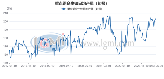 據中國鋼鐵工業協會統計數據顯示,2023年6月下旬重點鋼企生鐵日均產量202.87萬噸,旬環比上升0.52%,同比上升4.59%;6月下旬重點鋼企粗鋼日均產量224.6萬噸,旬環比下降0.74%,同比上升7.0%;6月下旬重點鋼企鋼材日均產量230.65萬噸,旬環比上升6.41%,同比上升6.9%。