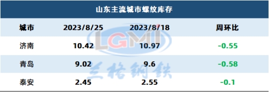 本周山東區域庫存情況表現不一,建材庫存小幅下降,板材區域窄幅增加。具體來看截止到8月26日,建材方面,濟南螺紋庫存總量10.42萬噸,較上周下降0.55萬噸;青島螺紋庫存9.02萬噸,較上周下降0.58萬噸;泰安螺紋庫存2.45萬噸,較上周微降0.1萬噸。