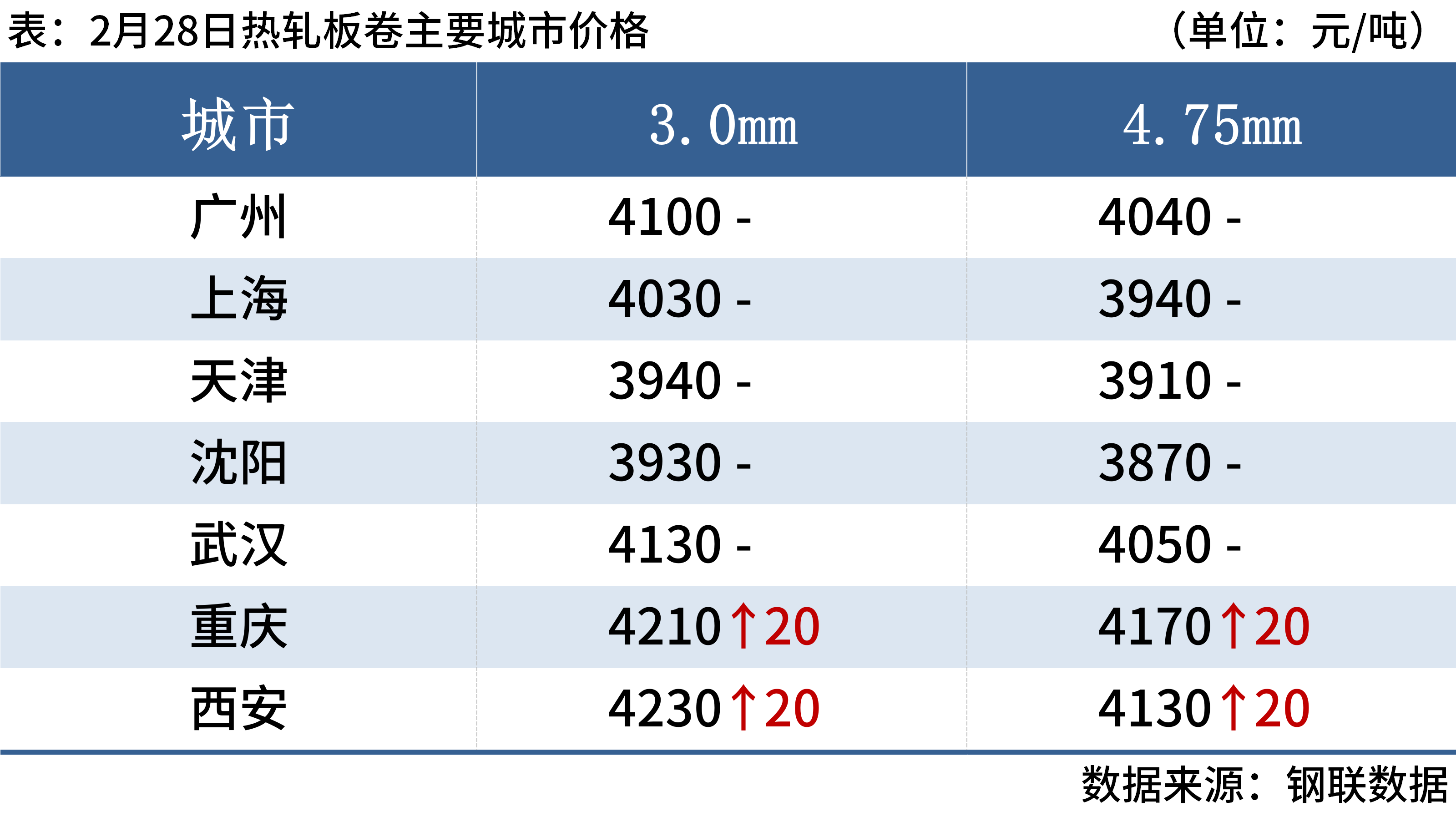 熱軋板卷:2月28日,全國(guó)24個(gè)主要城市4.75mm熱軋板卷均價(jià)4053元/噸,較上個(gè)交易日上漲4元/噸。元宵節(jié)過(guò)后,下游逐步復(fù)工,終端需求陸續(xù)恢復(fù),商家反饋成交有所增加,市場(chǎng)心態(tài)有所好轉(zhuǎn),但目前仍處于需求驗(yàn)證階段,近期價(jià)格或維持震蕩運(yùn)行。