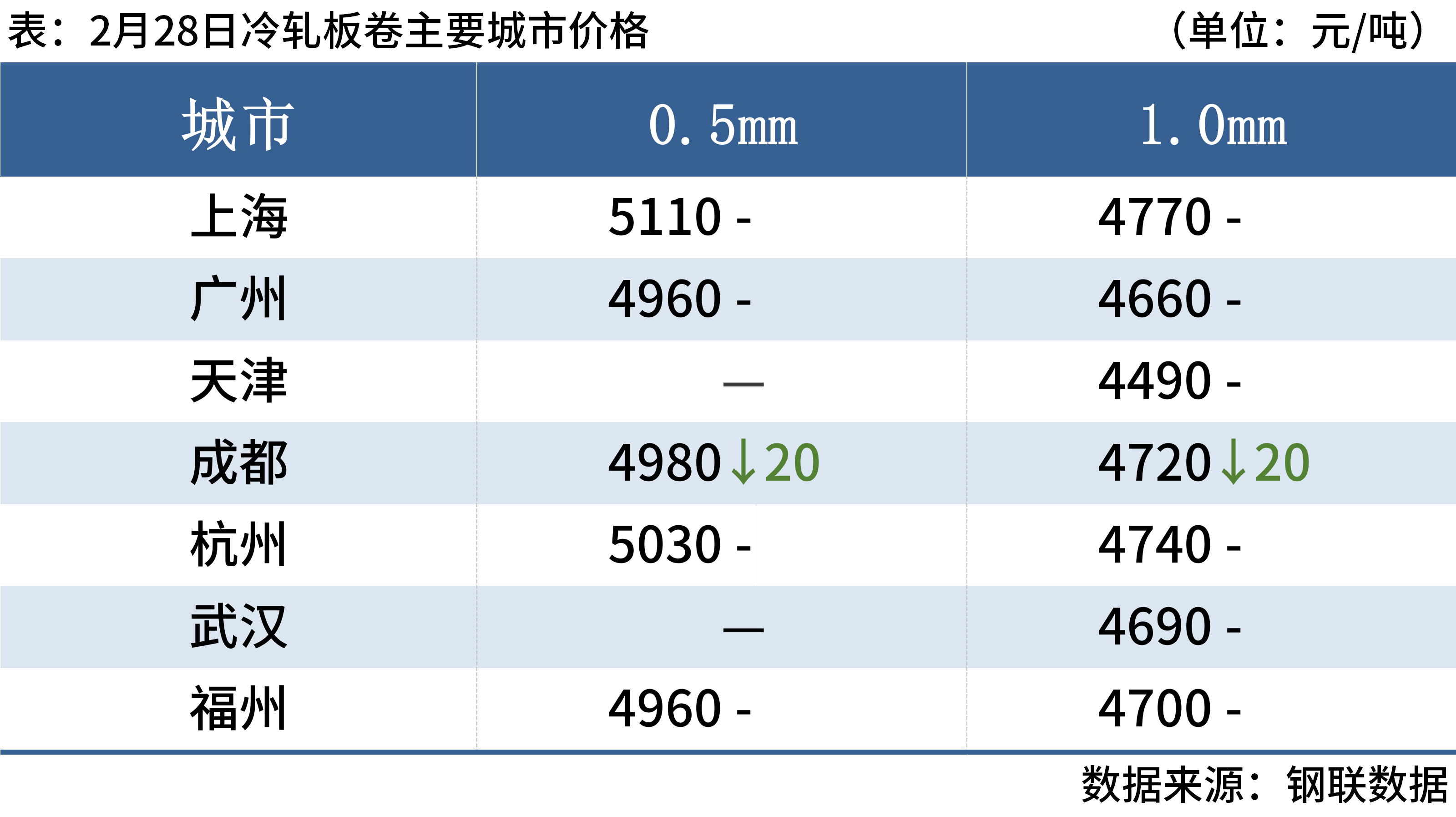 冷軋板卷:2月28日,全國(guó)24個(gè)主要城市1.0mm冷卷均價(jià)4717元/噸,較上個(gè)交易日下跌3元/噸。冷軋市場(chǎng)需求釋放速度緩慢,庫(kù)存處于累庫(kù)階段,貿(mào)易商為保成交仍選擇降價(jià)出售。2月大部分鋼廠結(jié)算價(jià)較1月相比不變,成本端有一定的支撐,但庫(kù)存壓力增大,貿(mào)易商對(duì)后市行情持謹(jǐn)慎偏悲觀心態(tài)看待,預(yù)計(jì)29日全國(guó)冷軋價(jià)格整體窄幅震蕩運(yùn)行為主。