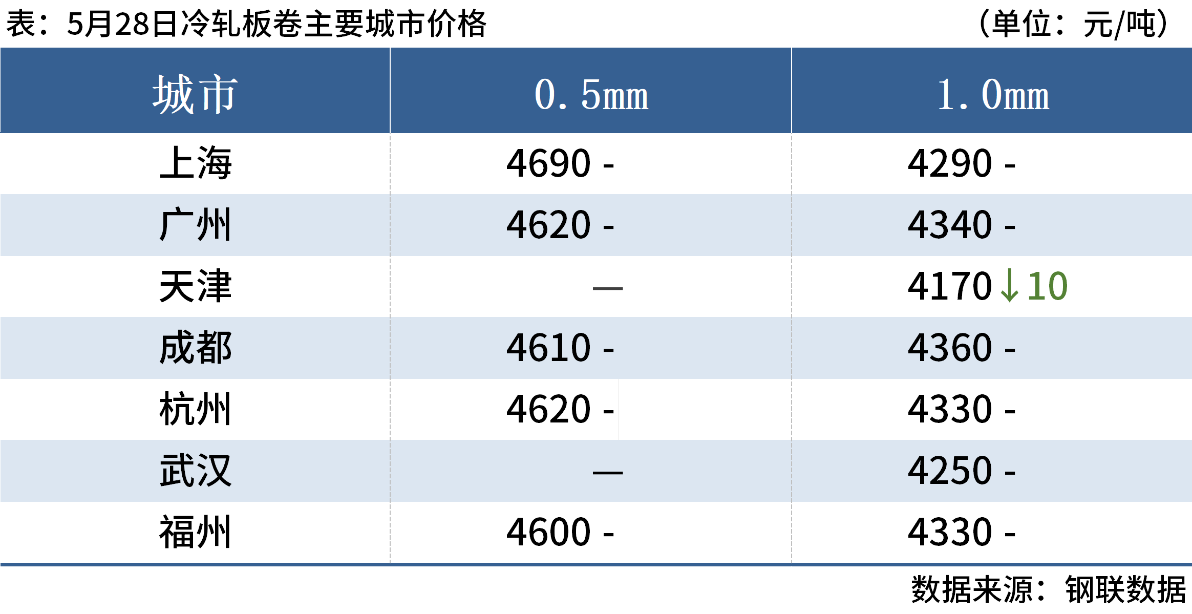 冷軋板卷:5月28日,全國冷軋板卷現貨價格盤整偏弱運行,全國均價4344元/噸,較上一交易日下跌1元/噸。具體來看,早間商家多暫穩報價,隨著期貨熱卷高開低走,市場觀望情緒濃厚,日內成交不佳。據貿易商表示,冷軋板卷在庫存去化不暢及下游消費不佳的情況下,價格不如熱軋板卷漲速較快,冷熱價差持續收窄,但盡管如此,目前生產端也暫未見檢修需求,產能利用率繼續高位維持,市場心態多謹慎,操作上仍以出貨去庫存為主。綜上所述,預計29日國內市場冷軋板卷價格或將繼續震蕩偏弱運行。