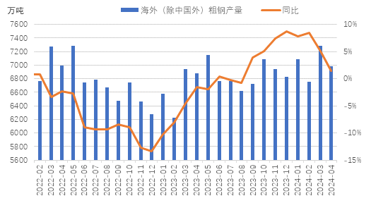 海外鋼鐵產量繼續呈現同比上升局面,但增幅持續2個月回落。蘭格鋼鐵研究中心監測數據顯示,2024年4月份,中國以外全球其他地區產量為6980萬噸,同比增長1.5%(詳見圖3),增速較上月繼續回落3.5個百分點。