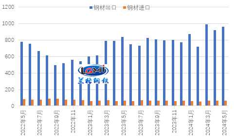 2024年5月份我國鋼材出口繼續呈現同比增長態勢。當前,我國鋼材出口價格優勢猶存,但幅度有繼續收窄之勢;海外鋼材市場供應同比仍呈回升態勢,但增速繼續放緩;全球制造業指數改善動力不足,區域分化明顯,外需景氣度繼續承壓,同時歐美貿易保護加強或對未來鋼材出口形成抑制;但我國鋼鐵企業出口訂單指數仍在擴張區間運行,短期內對鋼材出口仍形成一定支撐。蘭格鋼鐵研究中心預計6月份我國鋼材出口仍有望維持近千萬噸水平,能否破千拭目以待。