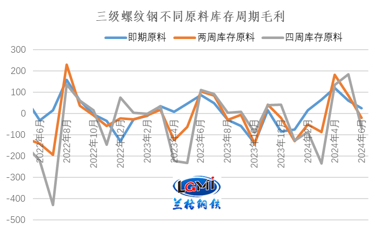 隨著原料價格波動,不同原料庫存周期成本差異明顯。為了便于客戶了解不同庫存周期的成本變化,蘭格鋼鐵研究中心對即期購買原料、兩周庫存原料、四周庫存原料的成本指數進行對比,如圖1所示。從圖可以看出,伴隨著主要原料價格的震蕩回落后企穩反彈,2024年6月份即期庫存原料測算成本呈現企穩態勢,而兩周庫存原料測算成本呈現逐步回落態勢,而四周庫存原料測算成本呈現見頂回落特征。