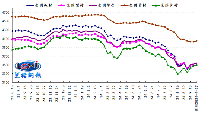 2024年第38周(2024.9.16-9.20)蘭格鋼鐵全國絕對價格指數(shù)為3518元,較上周上升1.3%,較去年同期下降15.6%;其中,蘭格鋼鐵長材絕對價格指數(shù)為3473元,較上周上升1.8%,較去年同期下降12.4%;蘭格鋼鐵型材絕對價格指數(shù)為3482元,較上周上升1.2%,較去年同期下降14.9%;蘭格鋼鐵板材絕對價格指數(shù)為3474元,較上周上升0.9%,較去年同期下降19.1%;蘭格鋼鐵管材絕對價格指數(shù)為4027元,較上周上升0.3%,較去年同期下降12.5%。