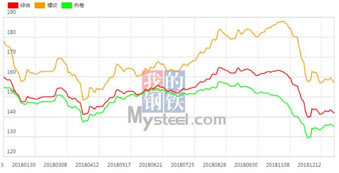 ?12月26日,國內鋼材指數(Myspic)綜合指數報141.92點(絕對價格指數3996),較上一交易日下跌0.25%。其中,螺紋鋼指數報156.99點(絕對價格指數3968),較上一交易日下跌0.39%;熱卷指數報135.13點(絕對價格指數3789),較上一交易日下跌0.14%。