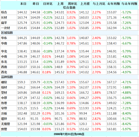 ?3月6日,國內(nèi)鋼材指數(shù)(Myspic)綜合指數(shù)報144.32點(diǎn)(絕對價格指數(shù)4065.4),較上一交易日下跌0.18%。其中,螺紋鋼指數(shù)報159.3點(diǎn)(絕對價格指數(shù)4026.7),較上一交易日下跌0.31%;熱卷指數(shù)報138.17點(diǎn)(絕對價格指數(shù)3874),較上一交易日下跌0.30%。