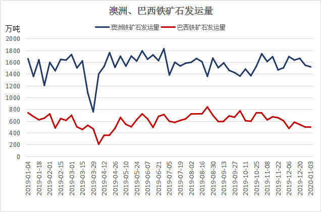 據(jù)Mysteel調(diào)研,2020年1月3日數(shù)據(jù)顯示,澳洲鐵礦石發(fā)運量為1519.6萬噸,較前一周同期下降28.3萬噸,較去年同期下降138.5萬噸,巴西鐵礦石發(fā)運總量為489萬噸,較前一周同期下降8.4萬噸,而其前一周發(fā)運量下降42.6萬噸。