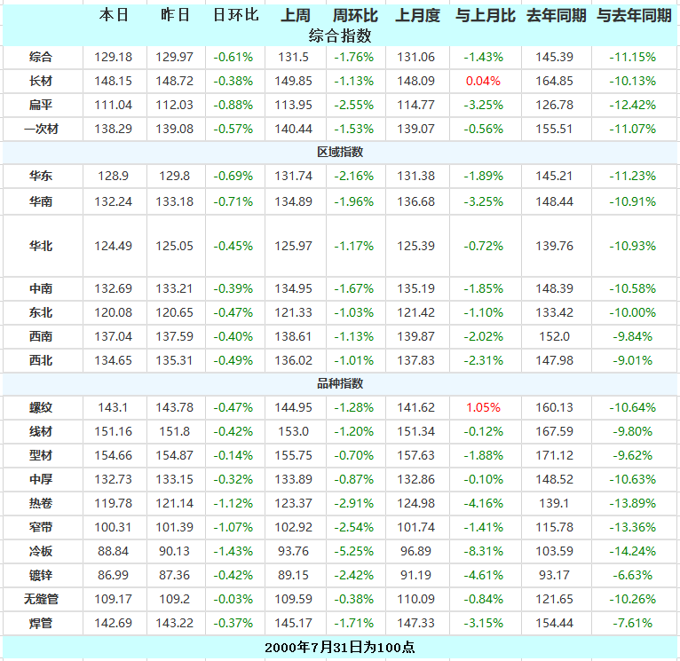 4月1日,國內鋼材指數(Myspic)綜合指數報129.18(絕對價格指數3639.5),較上一交易日下跌0.61%。其中,螺紋鋼指數報143.10(絕對價格指數3617.1),較上一交易日下跌0.47%;熱卷指數報119.78(絕對價格指數3358.5),較上一交易日下跌1.12%。